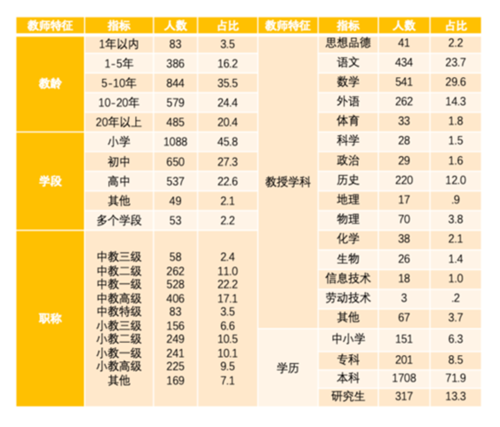 調查首先按省份配比樣本,然后通過極數云平臺采集數據。剔除無效樣本后,得到2377份合格樣本。具體樣本的地區分布、教師特征分布如下,由于職高與中職教師樣本較少,后面分析中就不再對這兩類數據進行統計,教授學科去除了兼授學科數據。各省份和學校分布情況見附錄。