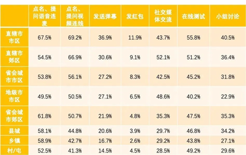 各區域的教師具體在使用七項互動方法的百分如表4,直轄市區的教師在語音視頻連線、發彈幕、發紅包、在線測試、小組討論等互動方法上的使用都是最多的。