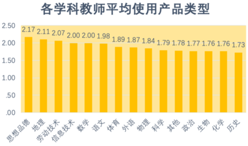 根據各學科教師平均使用產品類型分析,思想品德教師使用產品類型最為豐富,進一步通過ANOVA分析,發現不同學科的教師使用產品類型數量差異顯著(F=6.109,P=0.000)。