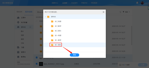 接下來,咱們就可以將文件歸類了~操作非常簡單,勾選對應的資料,例如可以選擇所有語文學科的資料,然后點擊“移動到”,就可以放到原先創建好的文件夾了。