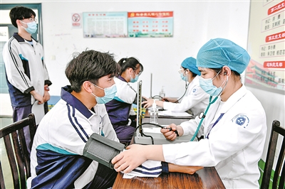 為避免考生與社會群體的接觸,浙江省湖州市長興縣今年高校招生體檢實行“送檢到校”。圖為該市中等衛生專業學校高三學生在測量血壓。譚云俸 攝