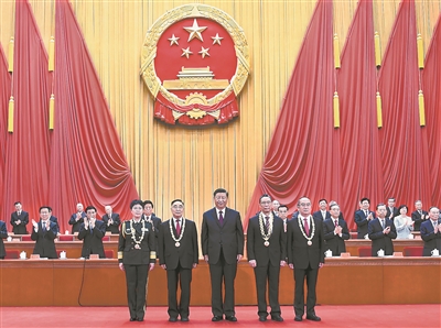 栗戰(zhàn)書宣讀習(xí)近平簽署的中華人民共和國主席令。主席令指出,為了隆重表彰在抗擊新冠肺炎疫情斗爭中作出杰出貢獻(xiàn)的功勛模范人物,弘揚(yáng)他們忠誠、擔(dān)當(dāng)、奉獻(xiàn)的崇高品質(zhì),根據(jù)第十三屆全國人民代表大會常務(wù)委員會第二十一次會議的決定,授予鐘南山“共和國勛章”,授予張伯禮、張定宇、陳薇“人民英雄”國家榮譽(yù)稱號。