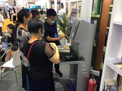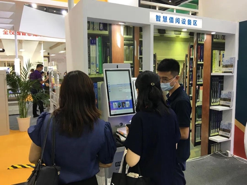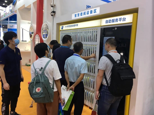 智慧借閱體驗區吸引了眾多觀展者的駐足,現場展示了微型圖書館、自助借還書機以及安全門。