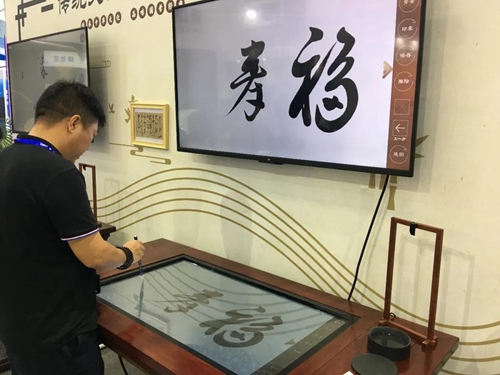 現場的數字書畫體驗區及5G&VR體驗區吸引了眾多觀展者駐足體驗。書法臺利用毛筆三維空間力檢測技術,以水代墨,以屏代紙,為大家提供了數字仿真書寫體驗。