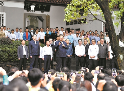 走出書院,廣場上擠滿了學(xué)生,大家齊聲歡呼。習(xí)近平微笑地向大家揮手致意,對(duì)同學(xué)們說,在全面建設(shè)社會(huì)主義現(xiàn)代化國家新征程上,同學(xué)們將是接過歷史接力棒的主力軍。希望大家不負(fù)時(shí)代重托,不負(fù)青春韶華,勤奮學(xué)習(xí),樹立正確的世界觀、人生觀、價(jià)值觀,走好人生道路,為實(shí)現(xiàn)第二個(gè)百年奮斗目標(biāo)、實(shí)現(xiàn)中華民族偉大復(fù)興的中國夢奉獻(xiàn)自己的智慧和力量!
