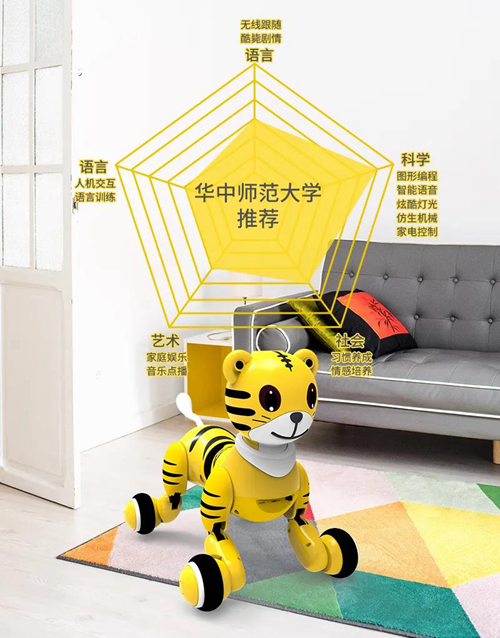 這是一款與華中師范大學聯合研發出品,并獲得教育部專家推薦的可編程可群聊的智能玩教具機器人。智能機器虎在教育方面與北京師范大學聯合出版機器虎編程圖書,包含了兒童學前教育的五大領域,健康、語言、社會、科學、藝術。