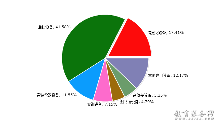 根據對教育裝備細分的歸納,教育裝備網將教育裝備具體劃分為七大類,即信息化設備(含智能平板、錄播系統、智慧黑板等),后勤設備(含校園基建、安防設備、食堂設備、課桌椅等),實驗儀器設備(含儀器儀表、實驗室平臺等),實訓設備(含實訓系統、實訓設施等),圖書館設備(含借還系統、微型圖書館等),音體美設備(含樂器、體育設施、美術用品等),其他專用設備(含創客教育、心理健康特教設備等)。