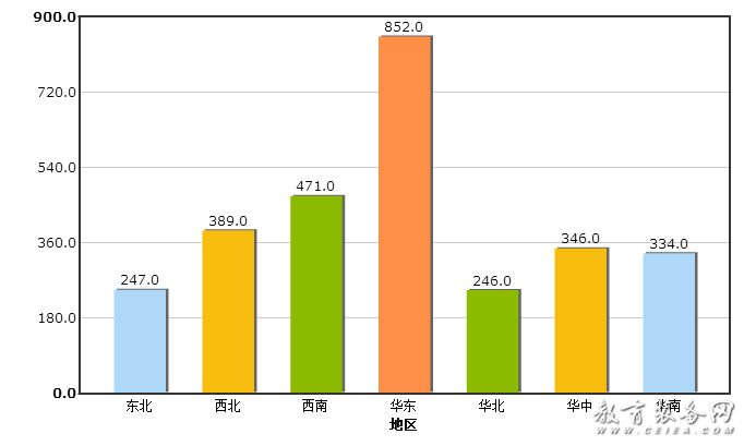 9月份教育裝備中標采購區域信息數據共2885條(中標信息區域設置為單選項)見圖6、圖7,華東地區中標信息量852條,占區域信息量的29.53%;西南地區中標信息量471條,占區域信息量的16.33%;西北地區中標信息量389條,占區域信息量的13.48%;華中地區中標信息量346條,占區域信息量的11.99%;華南地區中標信息量334條,占區域信息量的11.58%;東北地區教育裝備中標信息量247條,占區域信息量的8.56%;華北地區中標信息量246條,占區域信息量的8.53%。