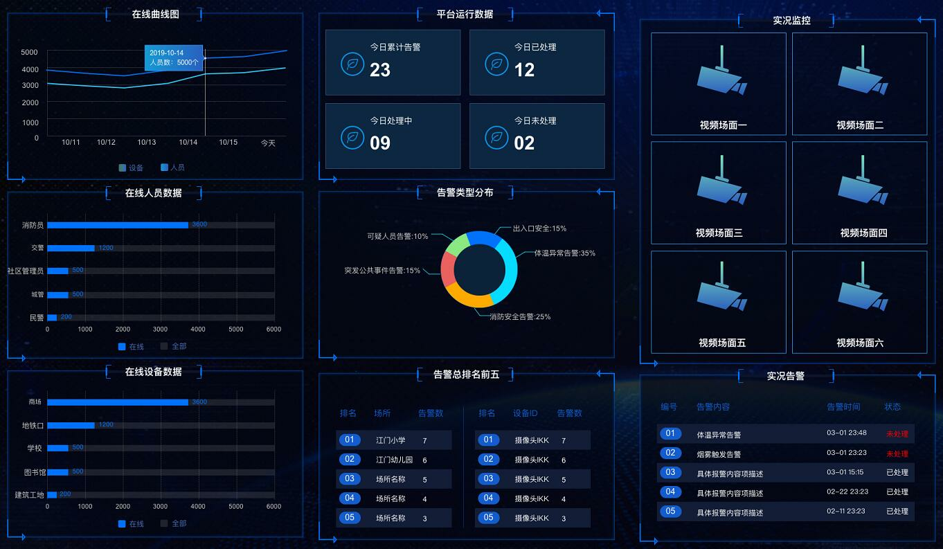 管理平臺綜合三大防(人防、物防、技防),將校園內所有人、事、物、場景集中在此平臺上呈現。教育管理者可以在平臺上管理校園內所有人員動態、管理流程、系統設備等,進行科學管理與決策。同時平臺與多個區域級、市級系統管理平臺對接,打通與公安系統、消防系統、應急系統、衛健委等融合,聯動。在開展校園24小時實時監控時,如發生預警,可根據事先制定相應的預案流程,智能分析,及時作出響應進行聯動執行,全方位保障學校師生安全。