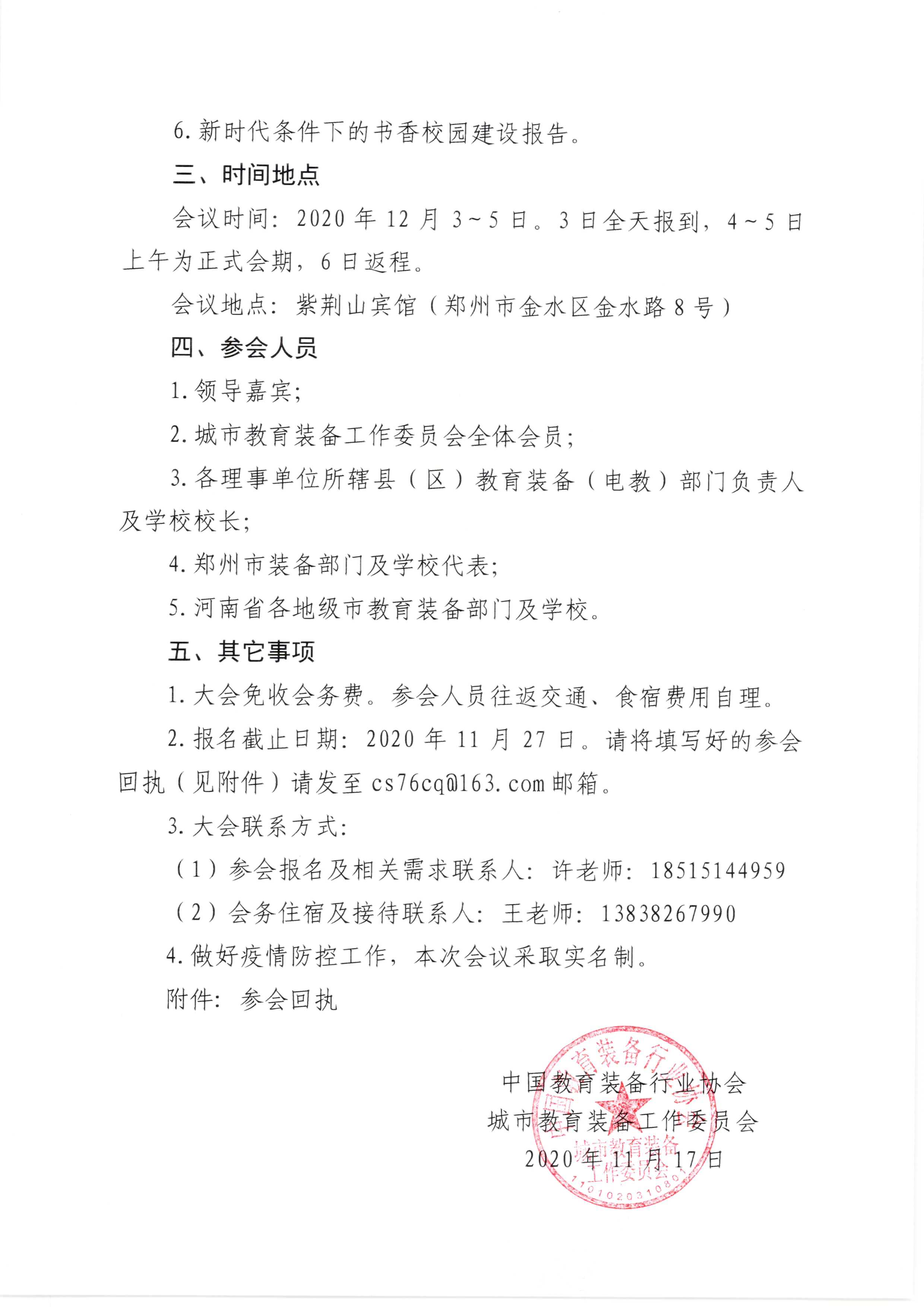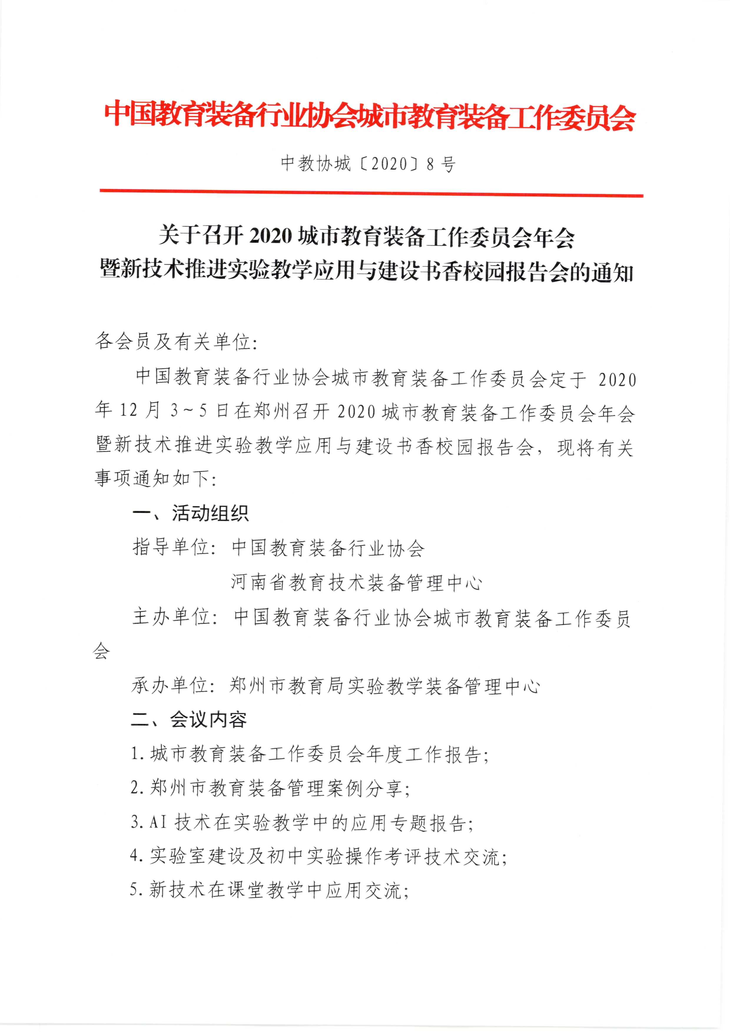 中國教育裝備行業協會城市教育裝備工作委員會定于2020年12月3~5日在鄭州召開2020城市教育裝備工作委員會年會暨新技術推進實驗教學應用與建設書香校園報告會,現將有關事項通知如下: