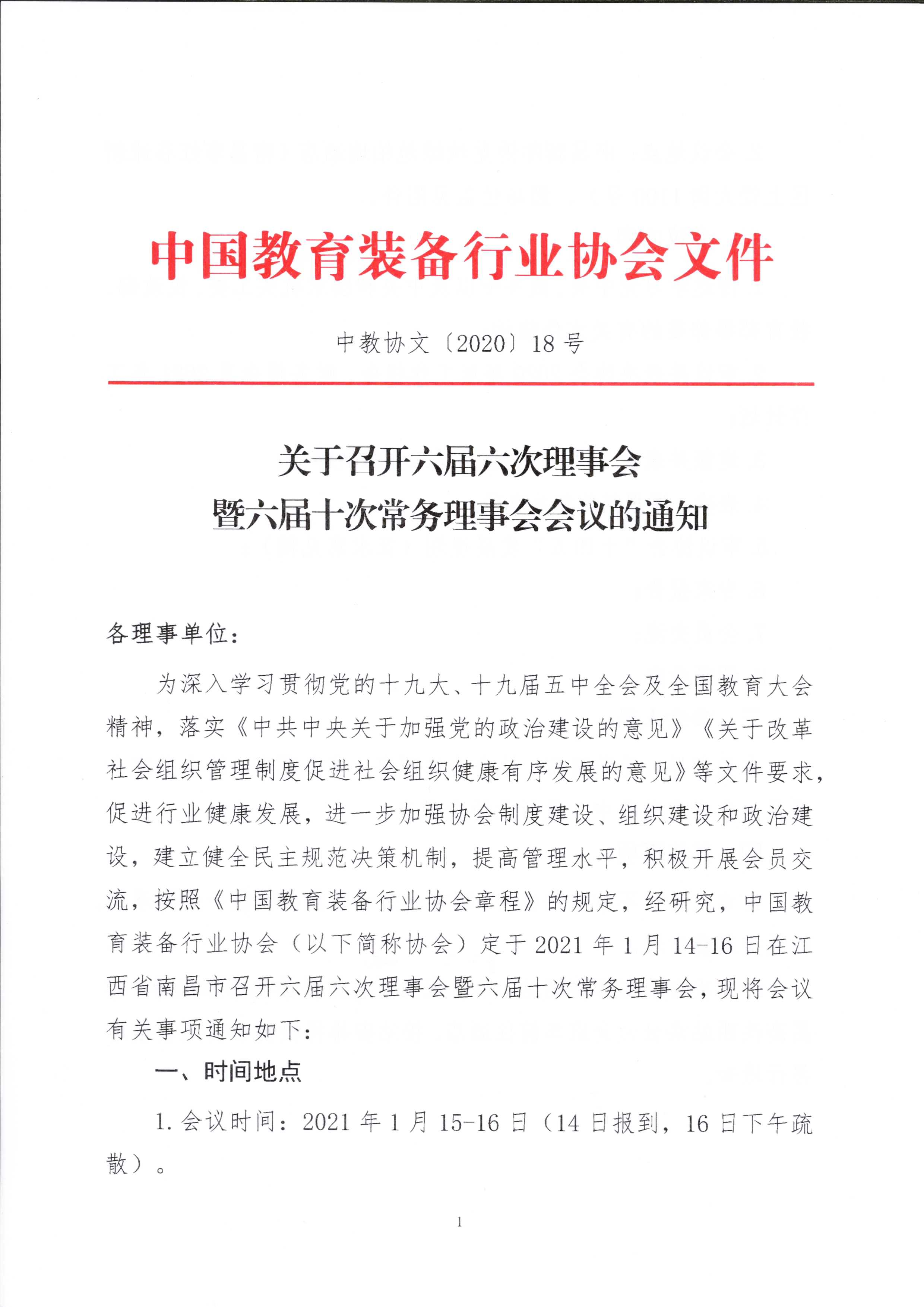 為深入學習貫徹黨的十九大、十九屆五中全會及全國教育大會精神,落實《中共中央關于加強黨的政治建設的意見》《關于改革社會組織管理制度促進社會組織健康有序發展的意見》等文件要求,促進行業健康發展,進一步加強協會制度建設、組織建設和政治建設,建立健全民主規范決策機制,提高管理水平,積極開展會員交流,按照《中國教育裝備行業協會章程》的規定,經研究,中國教育裝備行業協會(以下簡稱協會)定于2021年1月14-16日在江西省南昌市召開六屆六次理事會暨六屆十次常務理事會,現將會議有關事項通知如下: