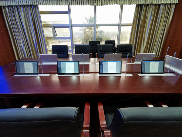 根據(jù)會議室布局,會議桌面安裝的無紙化一體升降端,采用1080P高清屏,屏幕觸控靈敏,書寫不晃。系統(tǒng)擁有豐富的會議功能,具備會議議程、簽到表決、文件上傳、資料閱讀、批注、同屏投影、白板互動、視頻播放、文檔加密、權(quán)限下載等,參會者只需手指觸控即可完成操作,整個會議過程高效又便捷。