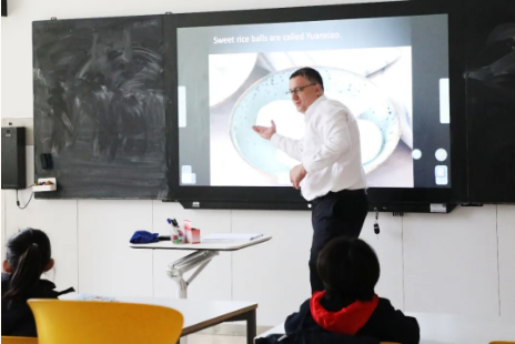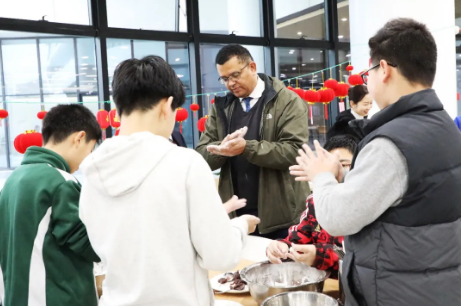 中、小學部的學生和老師利用早讀、活動課的時間,依次來到學校餐廳、后廚、烘焙教室,和面粉、加餡料、搓元宵,聽中外教們分享元宵節的習俗與趣聞。