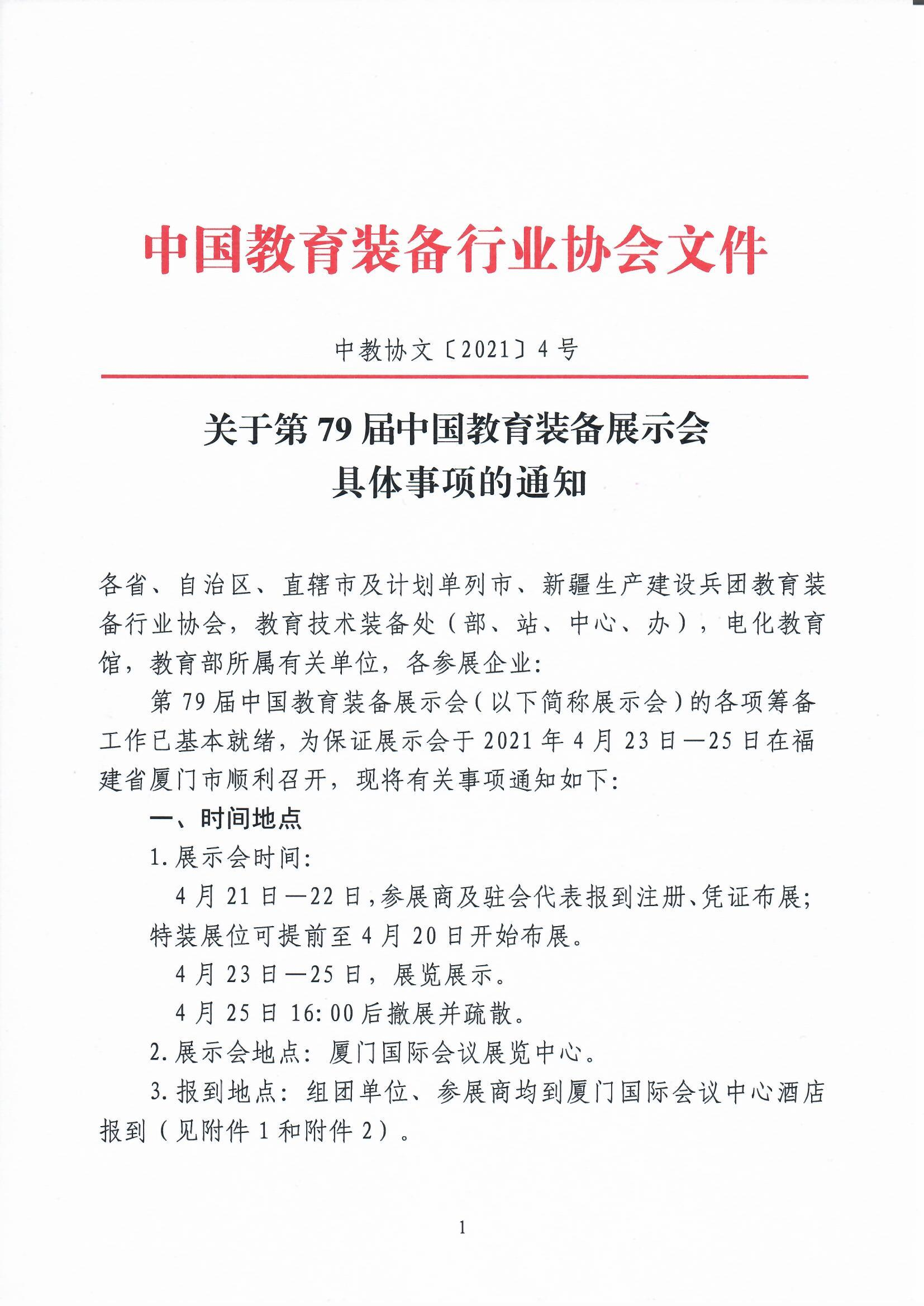 第79屆中國教育裝備展示會(以下簡稱展示會)的各項籌備工作已基本就緒,為保證展示會于2021年4月23日—25日在福建省廈門市順利召開,現將有關事項通知如下: