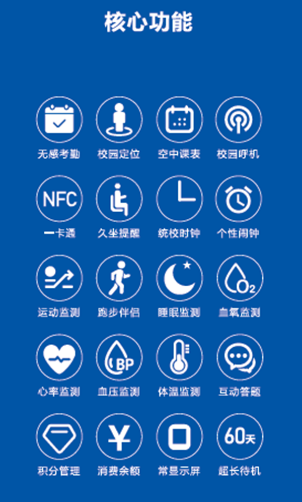 云教:感智手表能夠測量各項體征數據,包括:運動步數、心率、血氧、體溫、睡眠等健康數據。內置三個頻段支持一卡通、無感考勤、空中課表,更詳細參考下圖: