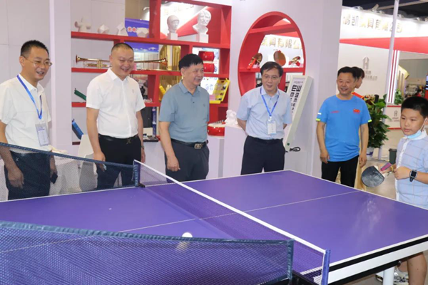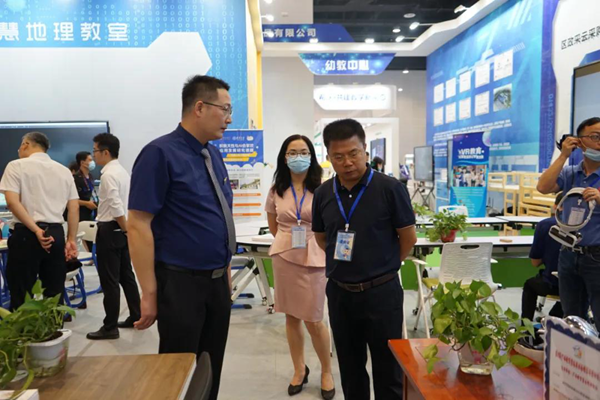 廣西教育裝備行業(yè)協(xié)會(huì)創(chuàng)會(huì)會(huì)長(zhǎng)陳鐵華(左三)、河北省教育裝備中心主任郭晉保(右三)蒞臨展位