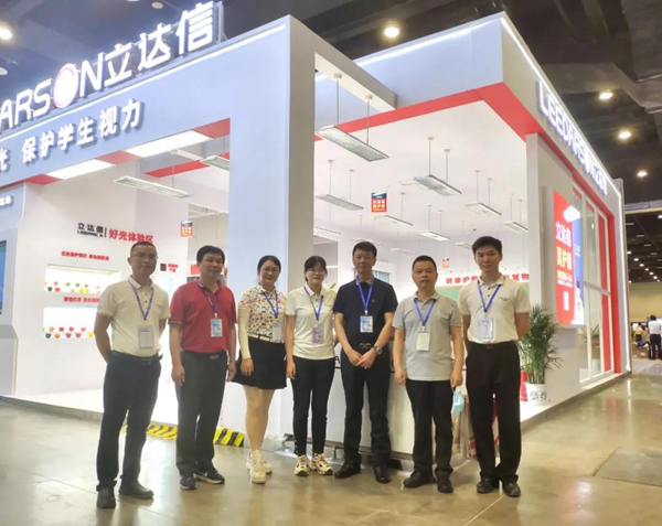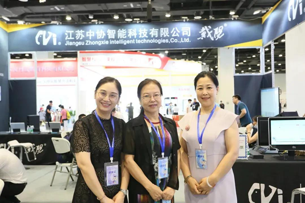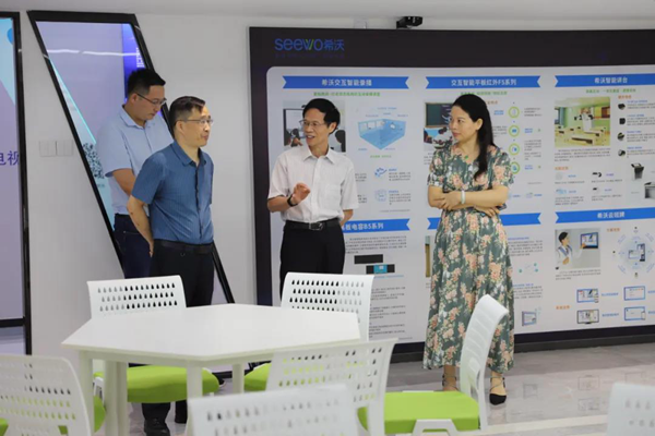 深圳市教育裝備行業(yè)協(xié)會(huì)會(huì)長(zhǎng)彭錦環(huán)(右三)、黨支部書(shū)記李山(右二)、福建省教育裝備行業(yè)協(xié)會(huì)副秘書(shū)長(zhǎng)陳鴻(左二)蒞臨展位