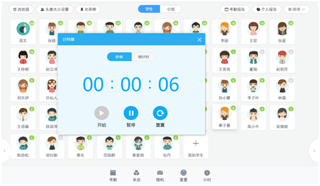 智能黑板配套的歐帝成長腳印可以設置隨機抽取學生提問,調動課堂積極性、營造學生緊張感、使注意力更集中。在課堂中引入課堂競賽、限時練習等方式活躍課堂氛圍。師生可以清晰地看到倒計時和秒表的醒目數字,增加課堂節奏感。