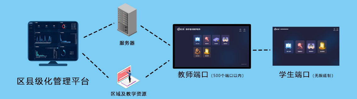 數(shù)字化音樂教學平臺是通過區(qū)/縣的服務(wù)器,建設(shè)區(qū)級/縣/校級教學平吧,結(jié)合配套教學內(nèi)容,輔助區(qū)/縣或?qū)W校開好、開齊音樂課,讓孩子享受優(yōu)質(zhì)的教學資源,更好的提升孩子音樂知識水平,推進區(qū)/縣或?qū)W校的美育素養(yǎng)發(fā)展。