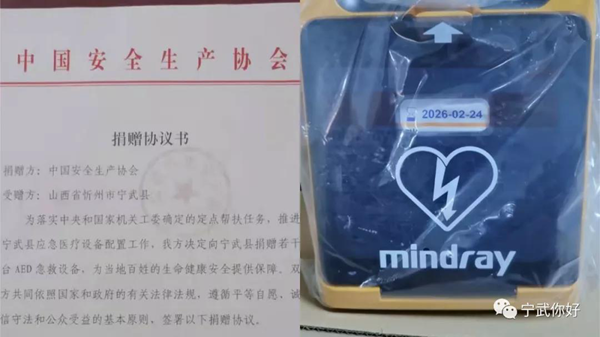 中國安全生產協會調研后,為增強寧武縣應急醫療設備配置工作,向寧武縣衛生健康和體育局捐贈30臺AED急救設備(半自動體外除顫器)及適配壁掛式櫥柜,價值76.5萬元。