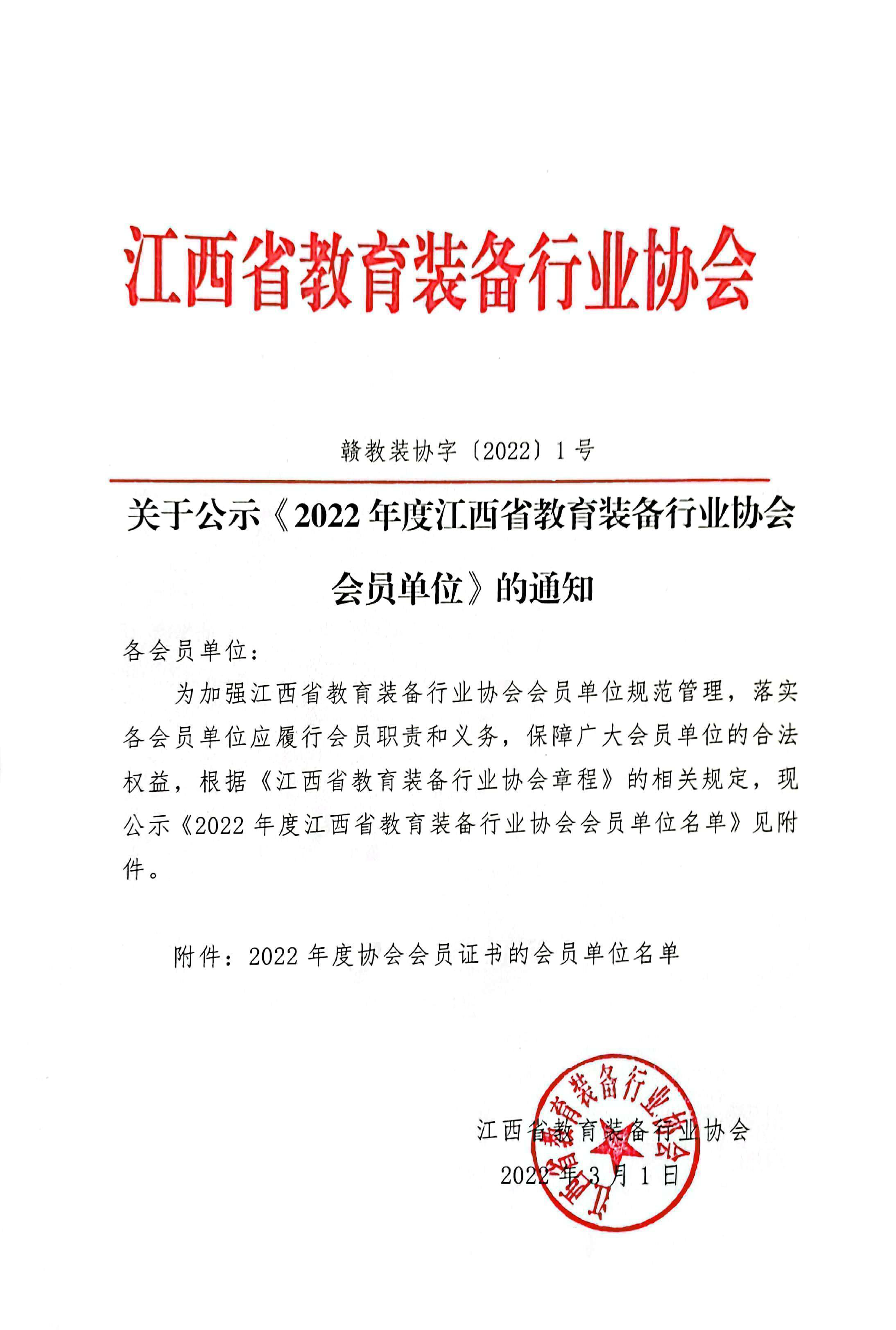 江西省教育裝備行業(yè)協(xié)會關于公示《2022年度江西省教育裝備行業(yè)協(xié)會會員單位》的通知