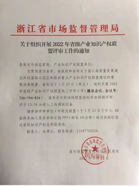 為貫徹落實省委、省政府和省知識產權局關于浙江高質量發展建設共同富裕示范區和推動重點產業知識產權聯盟建設的重要決策部署,省知識產權局于2022年3月25日(周五)下午,組織召開2022年省級產業知識產權聯盟線上評審會。浙江教育裝備產業知識產權聯盟、浙江醫療器械知識產權聯盟等14家聯盟被推薦參加本次省級備案專家評審會。本次評審會由省知識產權局運用促進處處長沈方英主持。