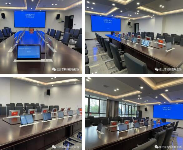 按照該會議室布局,為其配置了專業擴聲系統、語音識別系統以及14個點位的無紙化雙顯升降一體終端(含會討話筒),以嵌入式方式安裝在會議桌面,令會議室整體整潔、美觀。系統平臺采用的是JUSBE(佳比)自主研發并擁有著作權的軟件系統,集合了豐富強大的會議服務功能,只需觸控屏幕即可快速幫助參會者輕松掌握會議信息,高效完成會議內容。