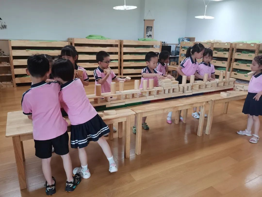只見他們在建構區收集了好多長方體和圓柱體的積木,陳正欽負責指揮,其他幼兒一起合作拼搭。他們會搭什么呢?我正思考著,不一會兒,他們搭好了一座結實的“城墻”,所有人開心地跳躍起來,然后開始了他們的第二場打仗游戲。