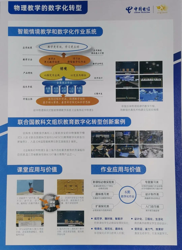 中國電信攜金角魚參加本次博覽會。金角魚以“物理教學的數字化轉型”為特色,為中國電信上海公司教育數字化轉型整體方案增添了價值、貢獻了力量。