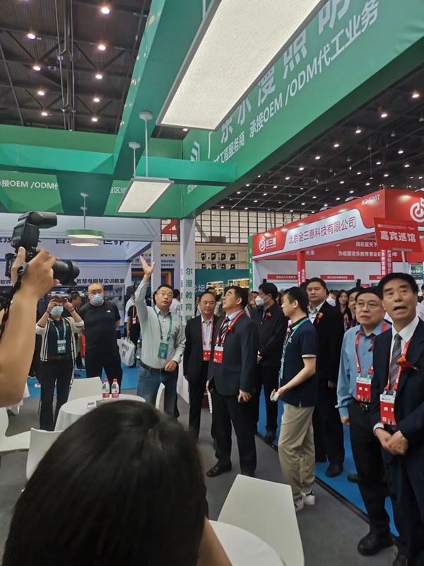 河南省教育廳副廳長刁玉華先生,蒞臨爾漫展位參觀指導,深入了解教育照明產品,與爾漫照明董事長張海濤先生親切交流。