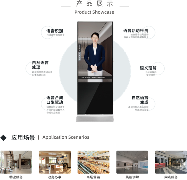 通過構(gòu)建智能交互場景覆蓋全流程的人臉識別、聲音活動監(jiān)測、語音識別、語義理解、文本生成,語音合成、口型驅(qū)動等人工智能自主研發(fā)能力,面向各行各業(yè),打造高仿真、人格化、個性化的“數(shù)字員工”,利用效率提升、增進創(chuàng)新、數(shù)據(jù)驅(qū)動等多重優(yōu)勢,為客戶創(chuàng)造核心價值。