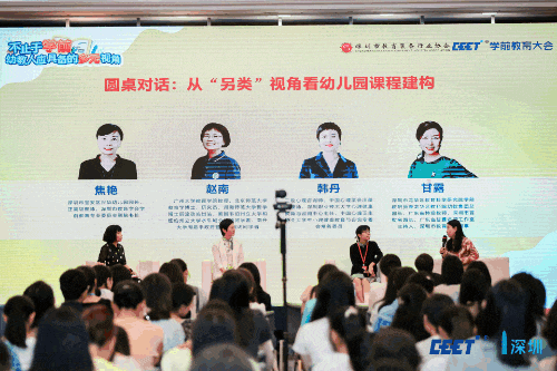 最后,一個特別的圓桌對話,以“另類視角看幼兒園課程建構”為主題,以面對面交流的形式圍繞話題進行對談。特邀嘉賓甘露園長,與焦艷、趙南和韓丹嘉賓一同,為現場來賓帶來了多維度、多角度的思考。