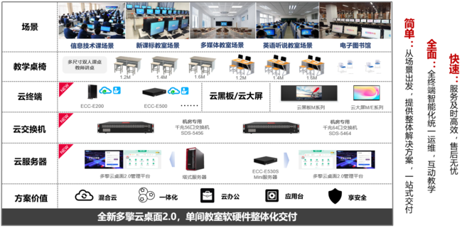 聯想多擎云桌面解決方案2.0,由云服務器、云終端、云交換機、云黑板/大屏、配套課桌椅組成,采用了國際領先的云桌面虛擬化技術,包括VDI、VOI、IDV、TCI四種云桌面架構,作為方案的“引擎”,實現未來云教室統一融合管理。該方案可選擇公有云、私有云和混合云等多種接入方式,將計算機應用的全場景云化管理,助力學校打造“一校一云一平臺”整體解決方案。同時,云桌面適配國產化芯片和操作系統,滿足教育信息技術應用創新建設的要求。