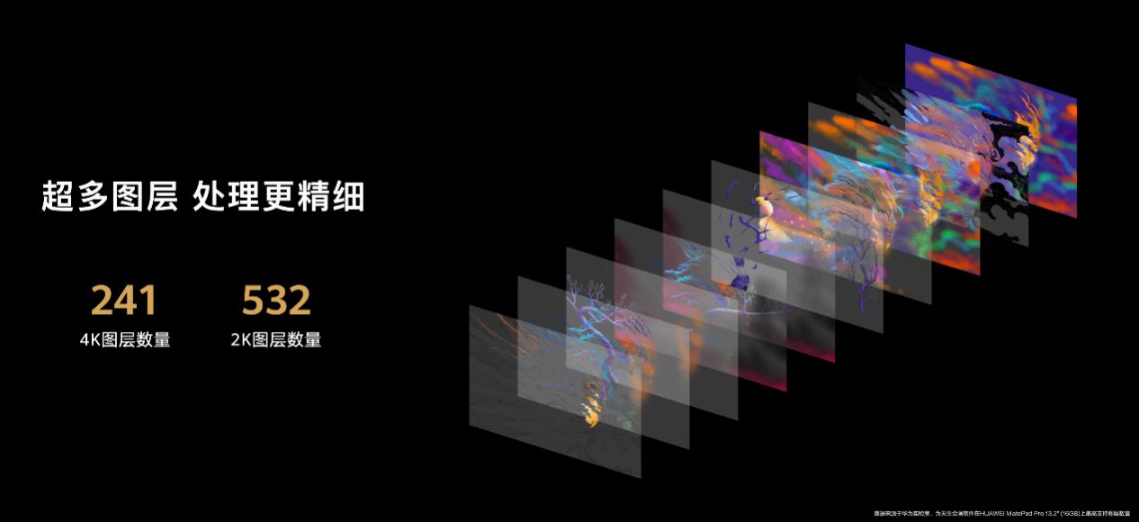 為天生會畫App打造的方天繪畫引擎,為用戶帶來極致流暢的使用體驗。方天繪畫引擎具備專業(yè)渲染、極速合成、高效存儲的強大能力,并通過軟硬芯整合的架構(gòu)創(chuàng)新,可大幅優(yōu)化性能負載,讓軟件運行更快,內(nèi)存占用更低,實現(xiàn)更低時延、更多圖層和高幀率。華為MatePad Pro 13.2英寸(16GB)運行天生會畫,在2K畫布下可支持創(chuàng)建532個圖層,實現(xiàn)了行業(yè)領(lǐng)先。