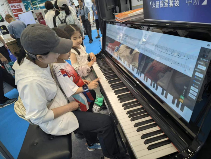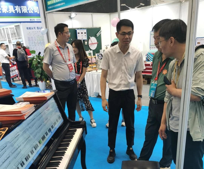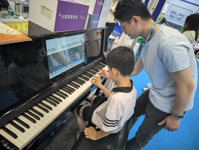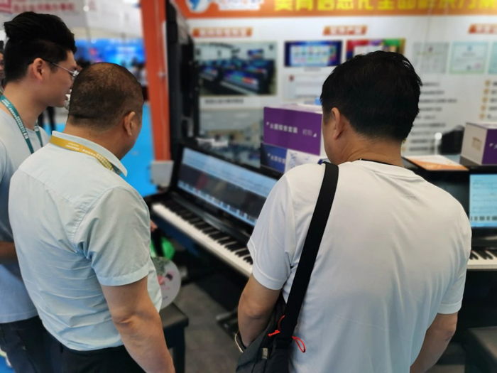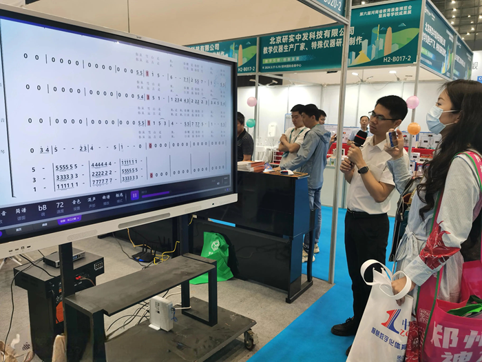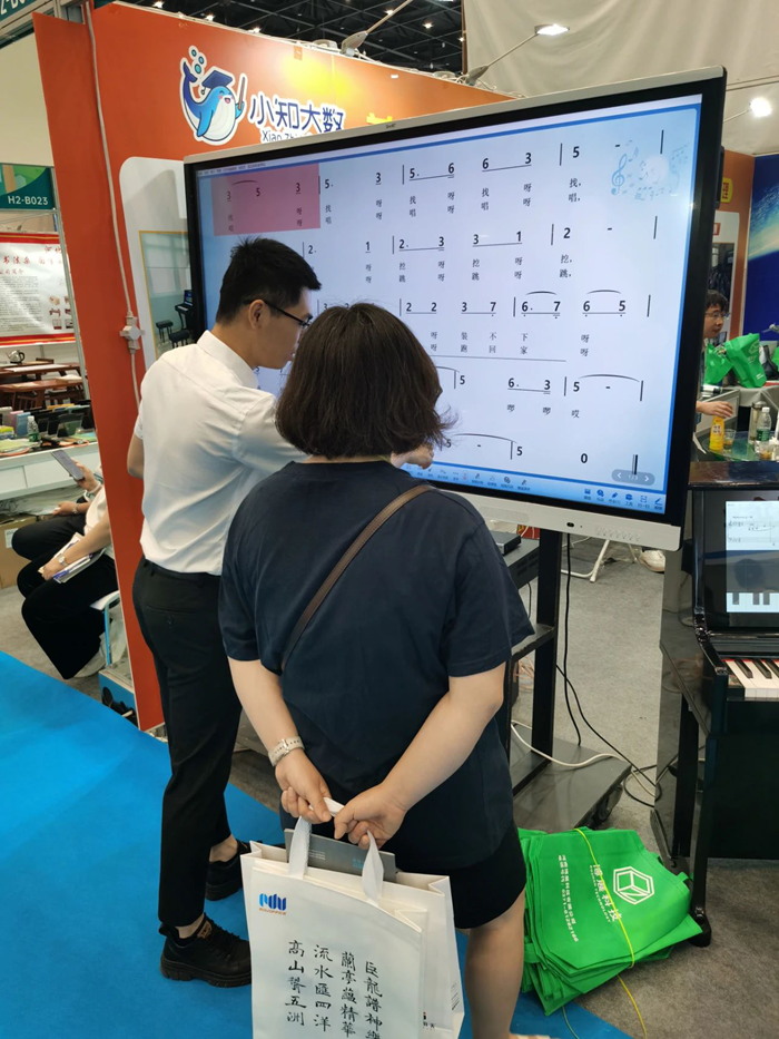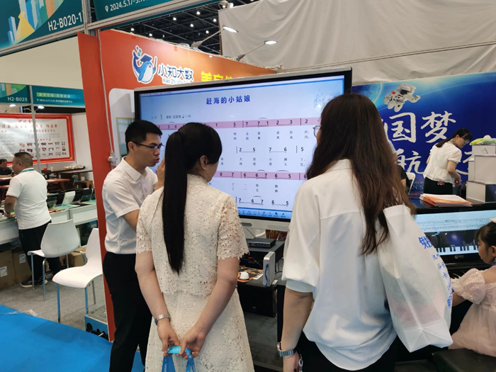 展會現場,工作人員熱情地接待了來訪的嘉賓,詳細介紹了小知大數智慧音樂教室、智慧美術教室、藝術素質測評方案、美育考試測評方案等優勢產品。