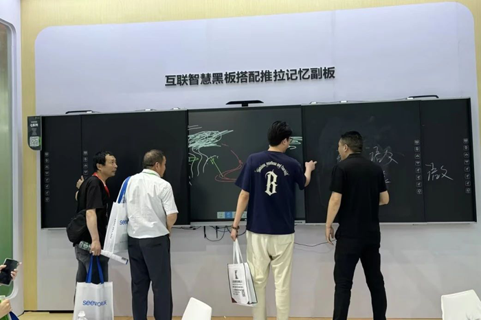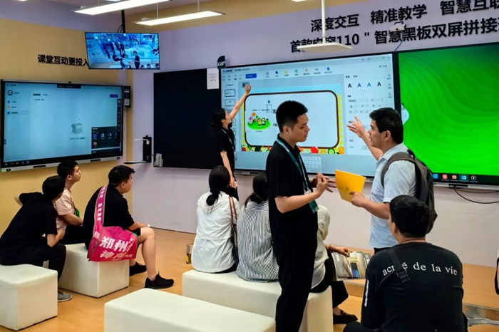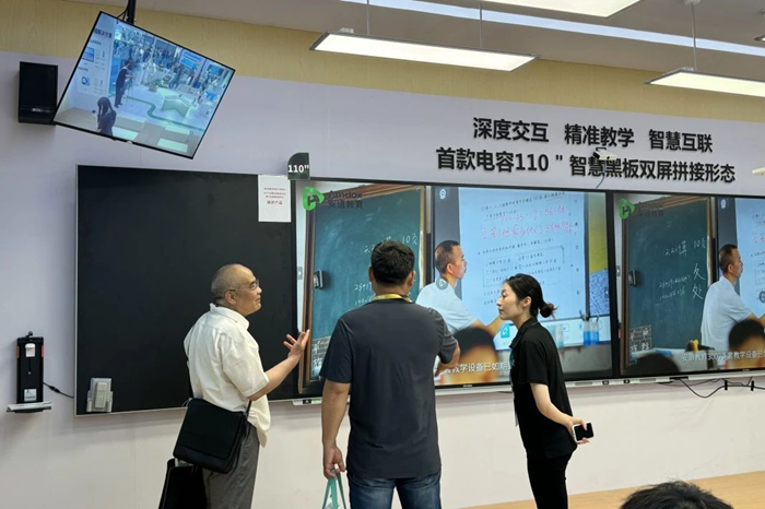 在智慧教室場景中,安道教育展示首款電容110寸雙屏拼接形態的智慧黑板Q系列,可實現多種教學模式的切換,適合各類教室應用需求,其高度集成的功能特色受到眾多參展者的青睞。