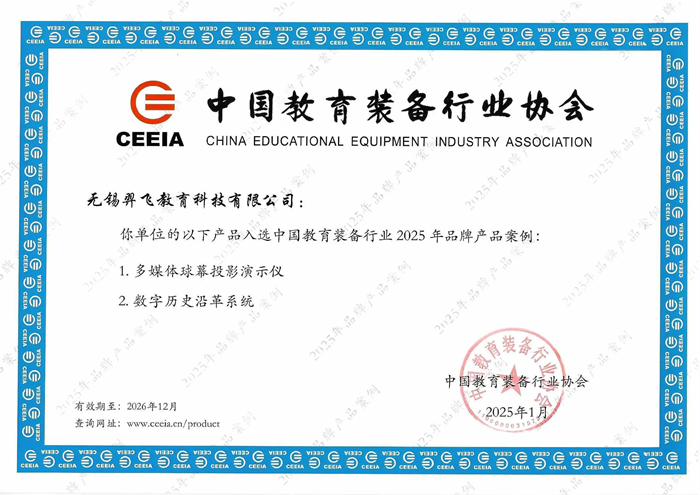 羿飛教育的多媒體球幕投影演示儀和數字歷史沿革系統成功入選中國教育裝備行業協會2025年品牌產品案例。