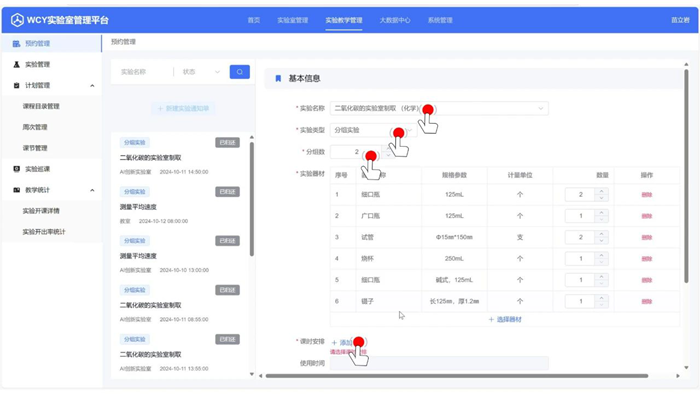 課程準備就緒后,老師需要提前進行實驗室預約。老師通過登錄威成亞實驗室管理系統(tǒng)完成操作。該系統(tǒng)內(nèi)置了初高中理化生裝備配置標準的所有實驗儀器清單,教師僅需點擊“實驗教學管理”中的“實驗預約”界面,創(chuàng)建實驗通知單,輸入所需的實驗信息,并完善課時安排,即可輕松快捷地完成預約。