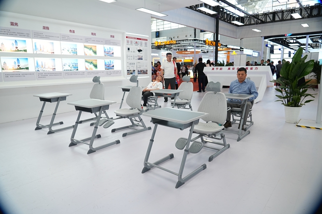 此外,立達信展示的護脊課桌椅同樣吸睛。該課桌椅符合人體工程學設計,靠背角度可調節至 135 度左右,搭配腿托,讓學生午休更舒適,同時有助于糾正坐姿,保護學生脊柱健康。