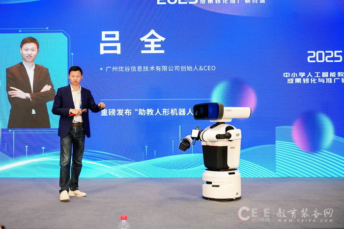 研討會期間廣州優谷信息技術有限公司創始人兼CEO呂全發布了全球首款“助教人形機器人”,舉行了《小學人工智能通識課程叢書》揭幕儀式。