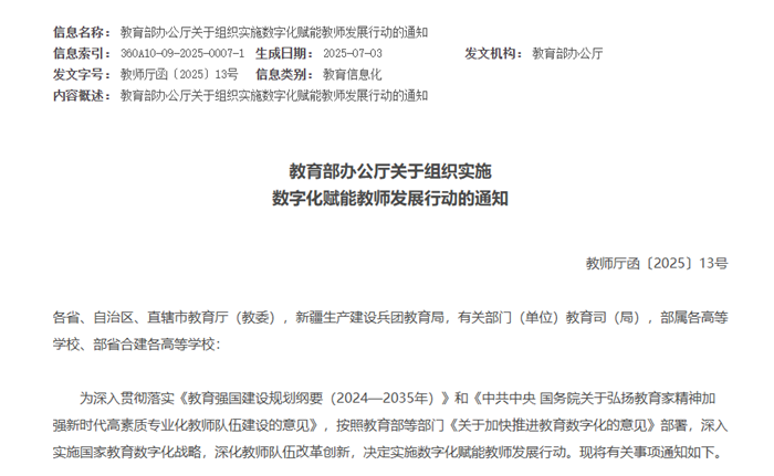 7月3日,教育部辦公廳發布關于組織實施數字化賦能教師發展行動的通知:按照教育部等部門《關于加快推進教育數字化的意見》部署,深入實施國家教育數字化戰略,深化教師隊伍改革創新,決定實施數字化賦能教師發展行動。