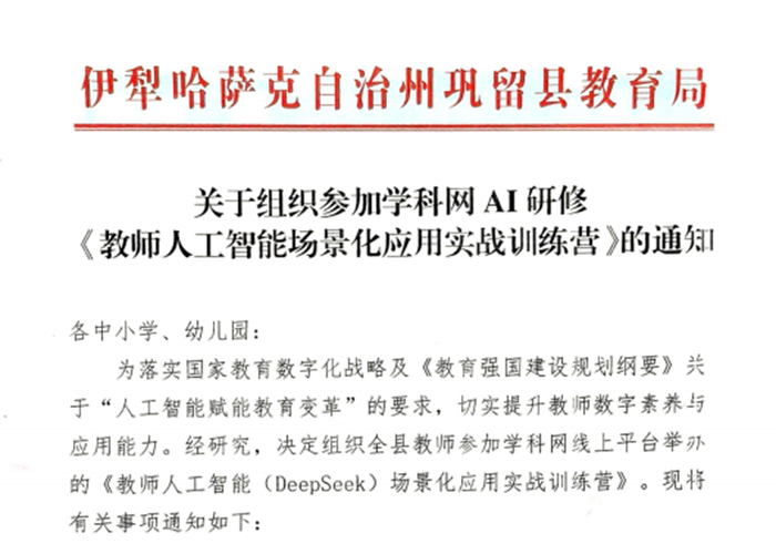 加強數字化教師隊伍建設,是未來教育數字化轉型的必經之路。『新疆伊犁哈薩克自治州鞏留縣教育局』積極響應政策,為落實國家教育數字化戰略及“人工智能賦能教育變革”的要求,決定于暑期在全縣范圍內組織教師進行線上學習,加速一線教師掌握人工智能應用方法,提升數字素養。