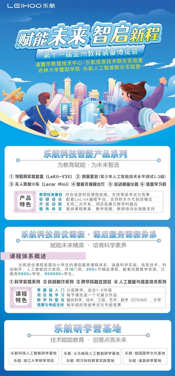 教育裝備是連接教育理念與實踐的橋梁,是激發學生創新思維的重要載體。在第十一屆亞洲教育裝備博覽會上,樂航科技將用專業的產品、創新的理念、豐富的實踐經驗,與您共同探討教育裝備的未來發展方向。