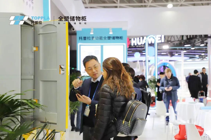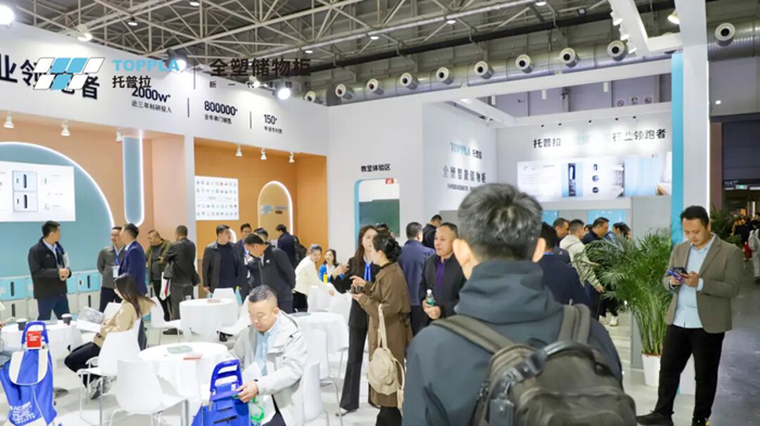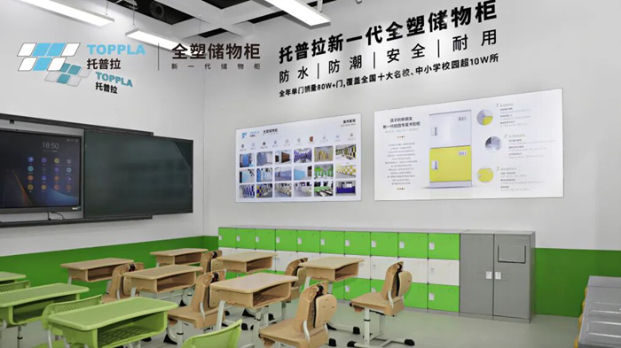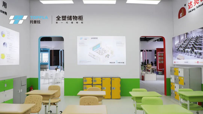 托普拉展位以創(chuàng)新設(shè)計(jì)打破傳統(tǒng)陳列模式,打造了教室、辦公室、宿舍等多元場景下的全塑儲(chǔ)物柜一體化解決方案。