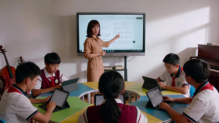 在北京金三惠科技有限公司打造的AI音樂課堂中,教師端與學生端均運行于Pad設(shè)備之上,可無縫對接大屏幕或電子白板,形成“一軟帶多端、一屏聯(lián)全課”的智慧教學場景。以自主研發(fā)的教學軟件為核心,融合人工智能技術(shù),構(gòu)建起人機協(xié)同、數(shù)據(jù)驅(qū)動、交互生成的新型音樂課堂生態(tài),真正實現(xiàn)“教得精準、學得主動、練得智能、評得科學”。