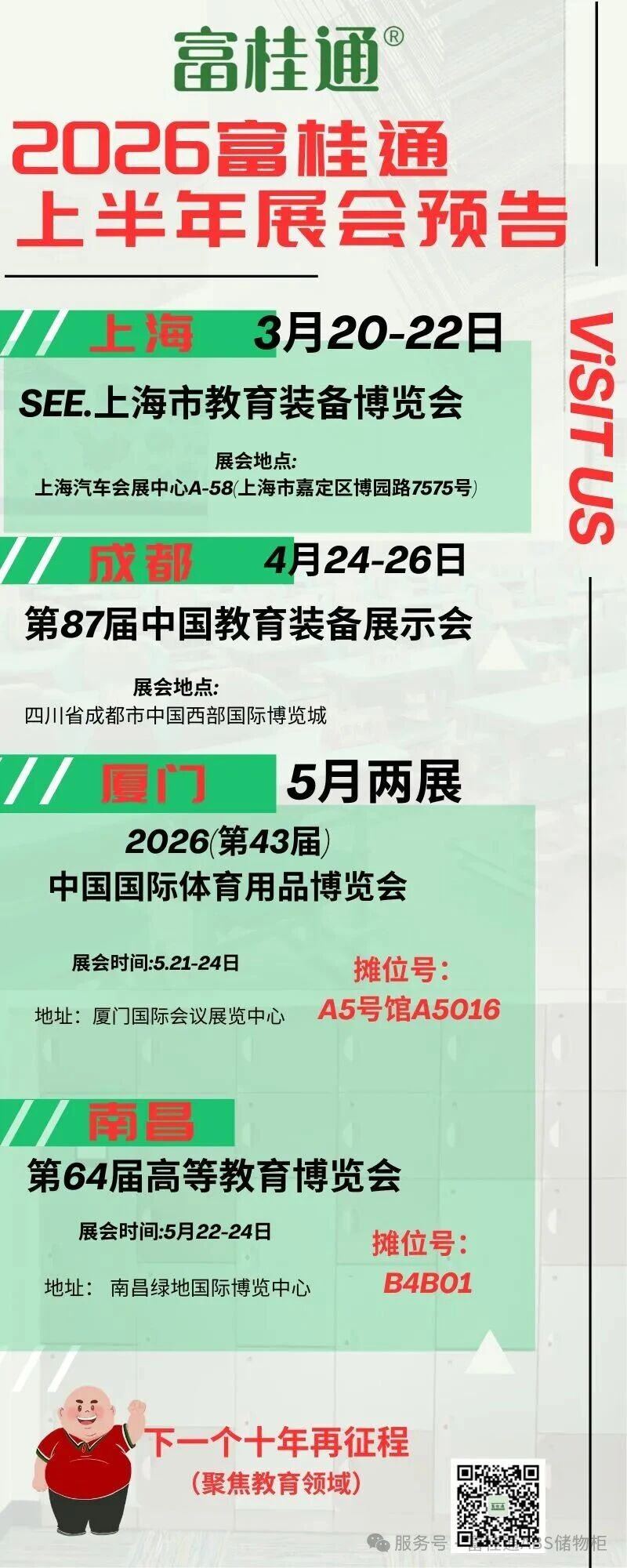 春風送暖,萬物向新!2026年上半年,富桂通將以飽滿的熱情奔赴上海、成都、廈門、南昌四大城市,攜最新教育裝備解決方案與儲物解決方案亮相行業頂級展會。我們期待與您面對面交流,共同探討教育裝備與國際體育裝備品的創新未來!