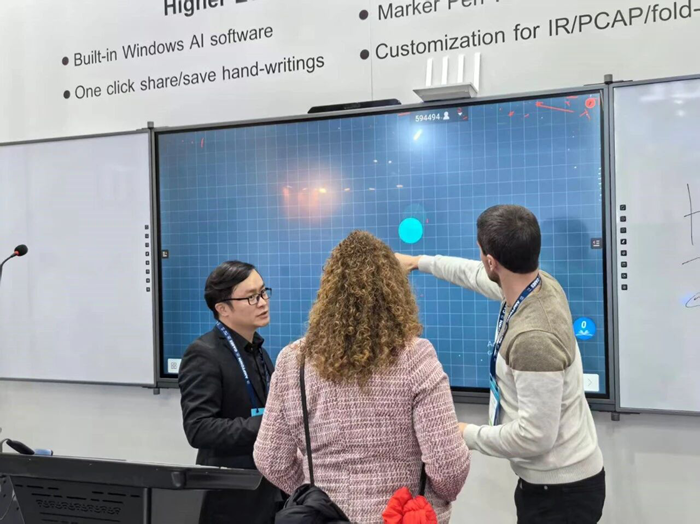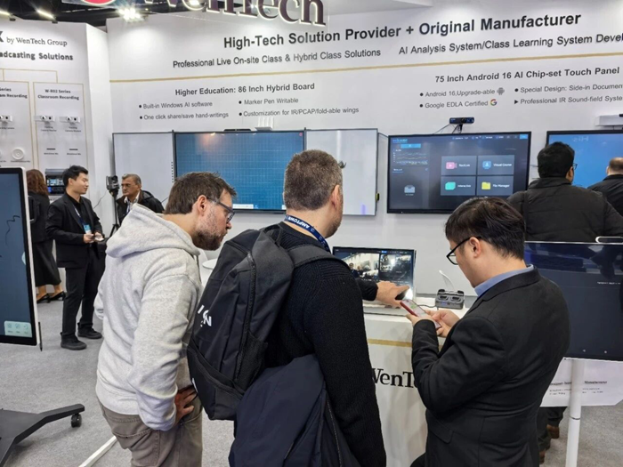 本次展會展示了全方案多尺寸的文香AI智能交互一體機,集成了4K超高清顯示、多點觸控、AI語音助手與邊緣計算模塊,成為教室與會議空間的“智慧大腦”。支持AI手勢識別與筆跡預測,書寫流暢無延遲;與錄播系統無縫聯動,實現“一鍵開啟錄課+智能導播+課后AI生成摘要”的全流程自動化。