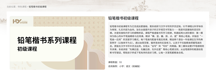 課程遵循書寫能力培養規律,從握筆姿勢與基礎控筆訓練入手,逐步過渡至筆畫拆解、部首結構與整字書寫訓練。