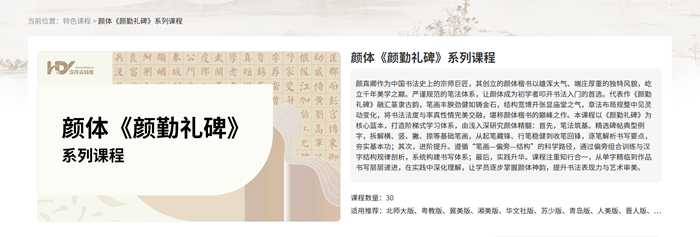 漢丹云聚焦傳統書法教育的數字化升級,重點打造“書法在線云課堂”、“鉛筆楷書系列課程”、“顏體《顏勤禮碑》課程”等核心產品,通過技術賦能打破傳統書法教學在空間與資源上的限制,推動書法教育向系統化、標準化與普惠化方向發展。