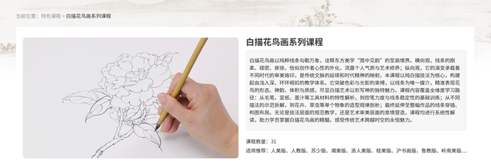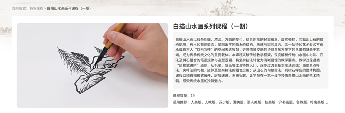 其中,中國畫系列課程以白描花鳥與山水為核心方向,構建完整學習路徑。從工具認知、基礎訓練到結構表現與整體構圖,層層遞進,系統解析傳統技法。課程通過對樹法、石法及結構關系的深入講解,將復雜筆墨規律轉化為清晰可學的教學內容,使學生在實踐中逐步掌握中國畫的表現方法與藝術內涵。